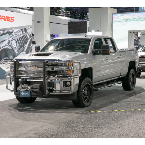 Basic. Standard. Stock. Some words were never intended to describe your truck, and it takes a certain type of hardworking truck accessory to meet your expectations. The LUVERNE Prowler Max grille guard equips your truck to tackle the toughest of jobs with its uncommon construction, comprehensive protection and arsenal of extra features. It begins with a bold, punched steel screen center section. This heavy-gauge mesh not only adds style to the Prowler Max but also increases protection for your grille, shielding it from rocks, debris and other threats. The center section features our signature logo reveal with contoured horizontal tubes to add even more protection and increase structural stability. Below the center section is a built-in 4" wide step with non-skid, diamond treads. The step blends perfectly with the grille guard and provides easier access when working under the hood, partic