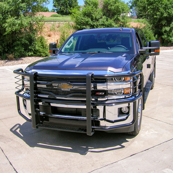 Basic. Standard. Stock. Some words were never intended to describe your truck, and it takes a certain type of hardworking truck accessory to meet your expectations. The LUVERNE Prowler Max grille guard equips your truck to tackle the toughest of jobs with its uncommon construction, comprehensive protection and arsenal of extra features. It begins with a bold, punched steel screen center section. This heavy-gauge mesh not only adds style to the Prowler Max but also increases protection for your grille, shielding it from rocks, debris and other threats. The center section features our signature logo reveal with contoured horizontal tubes to add even more protection and increase structural stability. Below the center section is a built-in 4" wide step with non-skid, diamond treads. The step blends perfectly with the grille guard and provides easier access when working under the hood, partic