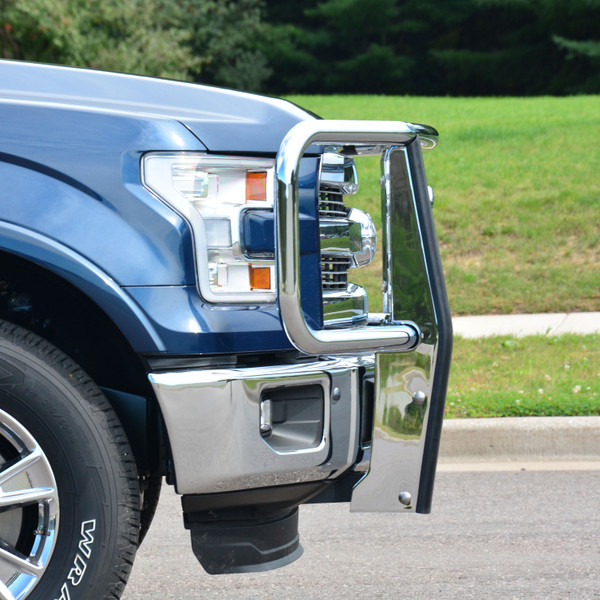 Adding accessories to your truck is all about highlighting and showing off its existing features, and no front-end accessory shows off these features quite like a LUVERNE grille guard. Our 2" tubular grille guard features our signature logo reveal and a vehicle-specific fit -- all to maximize front-end protection and truly make it all about your truck. It starts with our classic center section. The horizontal tubes are contoured to create our signature logo reveal, showing off your vehicle's badge with pride. The tubes also add extra protection for your vehicle's grille. To add some beef to the front end of your vehicle, the LUVERNE 2" brush guard is built tough. It is constructed from high-strength steel, assembled right here in the USA, to ensure the utmost quality. The frame-mounted uprights provide a solid structural base and are shielded with extruded rubber covers to better protect