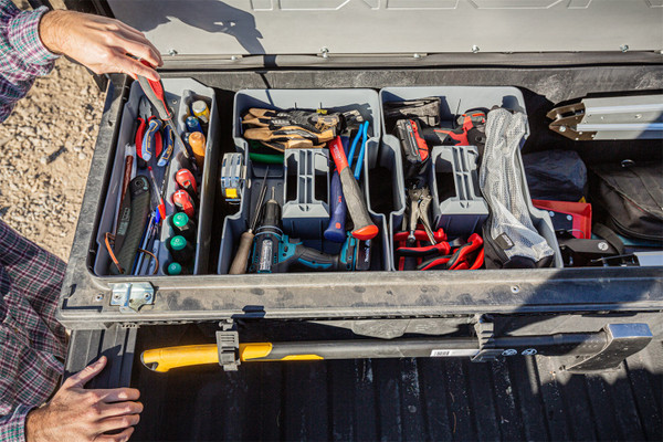 Securing into grooves on each side of the Tool Box, the Snack Tray provides convenient access to loose bits and small tools.