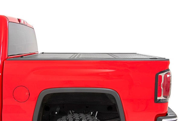 Protect your bed from weather and would-be thieves with Rough Country's sleek Low Profile Hard Tri-Fold Tonneau Covers. These durable, aircraft grade aluminum bed covers feature a flush, low profile design that gives your truck a clean, sleek look while protecting the contents of your bed.Each cover features a premium, black textured finish for uncompromised protection and killer good looks. The convenient triple-fold design allows you easy access to your bed or the ability to haul large items without entirely removing the cover. Just fold back one or two sections as needed to access the bed, or roll it all the way up and attach the durable storage straps and continue along your way with the cover in the open position. This cover features an easy-open cable latch system that latches in the first and second position, so that there's no need to walk to the other side of your truck to open the bed cover.These easy-to-install flush bed covers feature a secure mounting system that ensures a proper fit each and every time and can be assembled in no-time flat! This bed cover can't be opened when the tailgate is locked providing you with a secure area to store valuables with peace of mind. Includes a Limited Lifetime warranty.