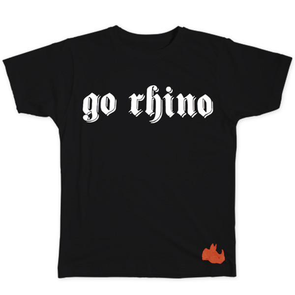 GO RHINO! Font T-Shirt - SBlack 100 Percent CottonWhite Go Rhino! Lettering In Stylish FontRed Go Rhino! Rhino Head Load At Bottom Right