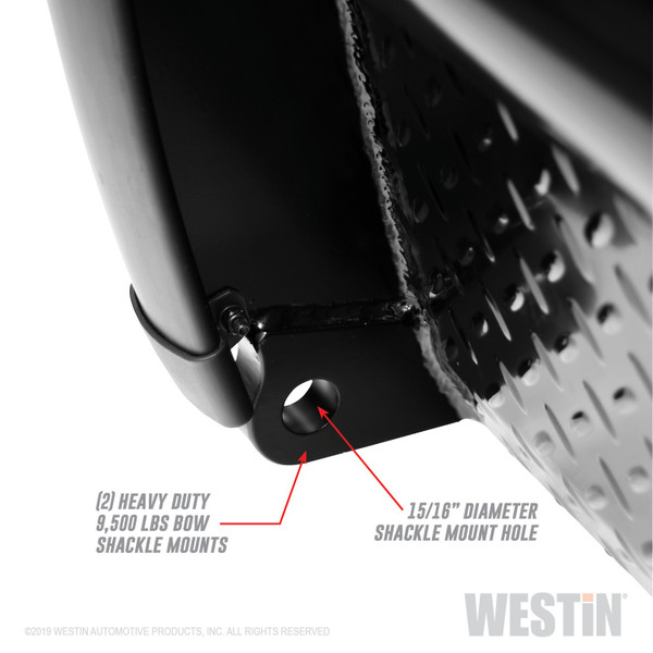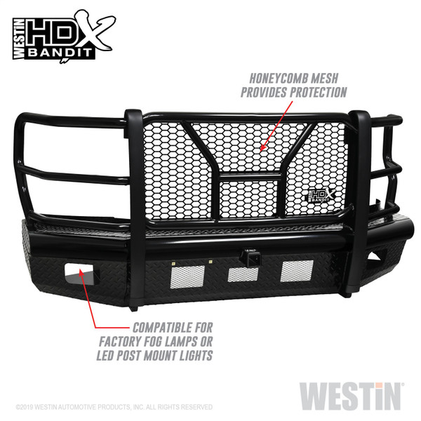 Westins HDX Bandit Bumper combines a heavy duty diamond plate steel bumper constructed of schedule 40 steel pipe with a stylish grille guard featuring 2 diameter outer wraparound wings and 2 3/4 wide upright rubber strips. Designed to protect headlights, grille, hood and front fenders from road hazards, debris and wildlife damage. Features a stylish metal honeycomb mesh screen, which allows maximum airflow to the intercooler or radiator area while accenting the front end styling with a clean and rugged look. Removable mesh screens allow for factory camera and adaptive cruise control options available on some late model Ford applications. HDX Bandit Bumper includes a built-in 2 receiver hitch and (2) heavy duty 9,500 lbs bow shackle mounts, capable of delivering multiple towing options. Compatible for factory fog lamps or LED post mount lights. In addition, some late model Ram and Chevrolet applications feature provisions for factory parking sensors. Bolt-on installation with hardware and mounting brackets included. Available in black powder coat finish.