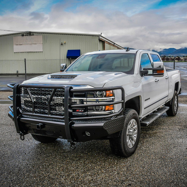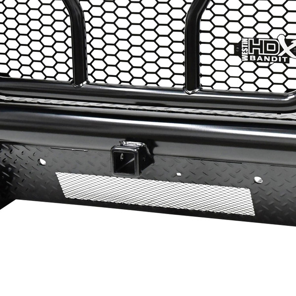 Westins HDX Bandit Bumper combines a heavy duty diamond plate steel bumper constructed of schedule 40 steel pipe with a stylish grille guard featuring 2 diameter outer wraparound wings and 2 3/4 wide upright rubber strips. Designed to protect headlights, grille, hood and front fenders from road hazards, debris and wildlife damage. Features a stylish metal honeycomb mesh screen, which allows maximum airflow to the intercooler or radiator area while accenting the front end styling with a clean and rugged look. Removable mesh screens allow for factory camera and adaptive cruise control options available on some late model Ford applications. HDX Bandit Bumper includes a built-in 2 receiver hitch and (2) heavy duty 9,500 lbs bow shackle mounts, capable of delivering multiple towing options. Compatible for factory fog lamps or LED post mount lights. In addition, some late model Ram and Chevrolet applications feature provisions for factory parking sensors. Bolt-on installation with hardware and mounting brackets included. Available in black powder coat finish.
