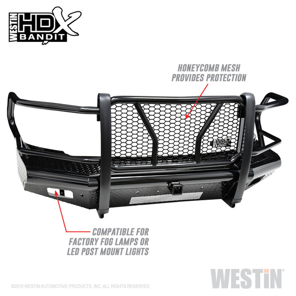 Westins HDX Bandit Bumper combines a heavy duty diamond plate steel bumper constructed of schedule 40 steel pipe with a stylish grille guard featuring 2 diameter outer wraparound wings and 2 3/4 wide upright rubber strips. Designed to protect headlights, grille, hood and front fenders from road hazards, debris and wildlife damage. Features a stylish metal honeycomb mesh screen, which allows maximum airflow to the intercooler or radiator area while accenting the front end styling with a clean and rugged look. Removable mesh screens allow for factory camera and adaptive cruise control options available on some late model Ford applications. HDX Bandit Bumper includes a built-in 2 receiver hitch and (2) heavy duty 9,500 lbs bow shackle mounts, capable of delivering multiple towing options. Compatible for factory fog lamps or LED post mount lights. In addition, some late model Ram and Chevrolet applications feature provisions for factory parking sensors. Bolt-on installation with hardware and mounting brackets included. Available in black powder coat finish.