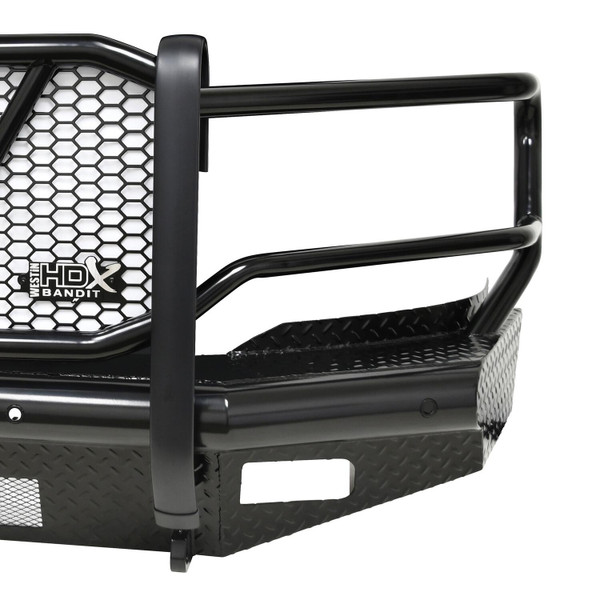 Westins HDX Bandit Bumper combines a heavy duty diamond plate steel bumper constructed of schedule 40 steel pipe with a stylish grille guard featuring 2 diameter outer wraparound wings and 2 3/4 wide upright rubber strips. Designed to protect headlights, grille, hood and front fenders from road hazards, debris and wildlife damage. Features a stylish metal honeycomb mesh screen, which allows maximum airflow to the intercooler or radiator area while accenting the front end styling with a clean and rugged look. Removable mesh screens allow for factory camera and adaptive cruise control options available on some late model Ford applications. HDX Bandit Bumper includes a built-in 2 receiver hitch and (2) heavy duty 9,500 lbs bow shackle mounts, capable of delivering multiple towing options. Compatible for factory fog lamps or LED post mount lights. In addition, some late model Ram and Chevrolet applications feature provisions for factory parking sensors. Bolt-on installation with hardware and mounting brackets included. Available in black powder coat finish.