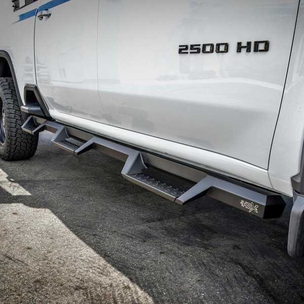 Westins HDX Drop Nerf Step Bars provide the rugged look and function that truck owners need and want. They feature a solid 1-piece steel construction and heavy duty punch plates creating high traction step areas. The HDX Drop Nerf Step Bars also feature Westins notched bar design which provides more than 2 of additional toe/heel placement versus competitive brands. Available in a textured black finish that complements Westin HDX Bumpers. The HDX Drop Steps have vehicle specific applications and include a vehicle specific mount kit, installation hardware and instructions.
