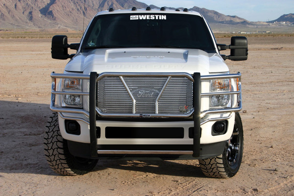 The HDX Grille Guard is the ultimate in extreme truck gear. Its a fully welded 1-piece grille guard that features full wraparound wings made of heavy duty 2 in. diameter tube. Uprights are finished and protected with extra wide rubber that is 1/8 in. thick and 2 3/4 in. wide resulting in a solid clean look. The full punch plate grille protects the vehicles grille area. HDX Grille Guards are available in stainless and black powder coat finish.