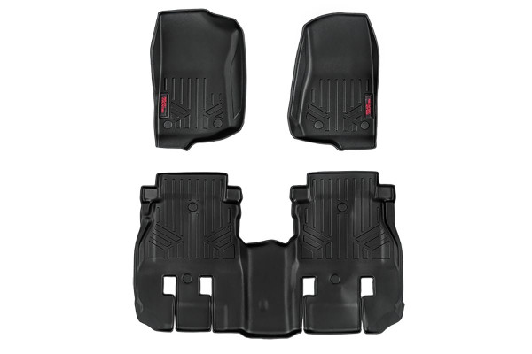 Keep your carpet in pristine condition with Rough Countrys Floor Armor: Heavy Duty Floor Mats and Rear Cargo Liners. These eco-friendly, semi-flexible floor mats are made of an ultra-durable Polyethylene that offers a strong, rigid shape thats incredibly easy to clean. Where simple rubber floor mats fail, Rough Countrys line of Floor Armor is guaranteed for life and will never crack, split, or break-down over time. The high-quality design extends the lifespan of your carpets and the raised-lip design ensures your interior will always be protected from mud, moisture, and more. These contoured floor mats are laser-measured for each make and model; designed to be a precise fit that grips the carpet and stays put. An aggressive looking textured surface gives your muddy shoes plenty of traction and looks great inside the vehicle. No matter what you track in, Rough Country Floor Armor is incredibly easy to clean. Just pop them out of the floorboards and rinse away the dirt! Includes Rough Countrys Lifetime Replacement Warranty.