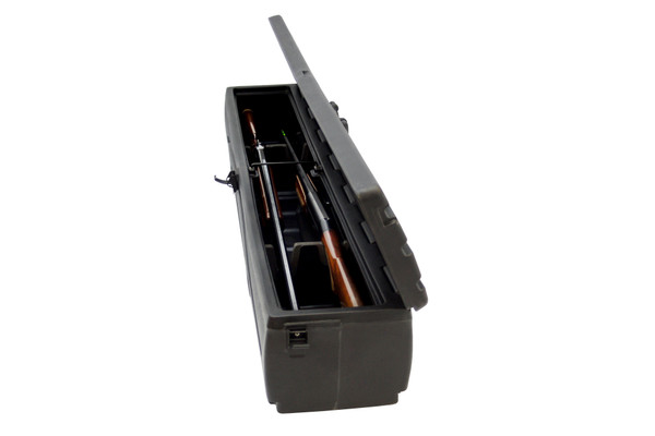 Perhaps the easiest space to access in the bed of your pickup truck is above the wheel well from the side of the truck. It just so happens that this is the most under-utilized space. The DU-HA(R) Humpstor mounts above the wheel well in your pickup bed where it is easily accessible from along side your truck. Called the Humpstor because it rides above the hump, it installs easily over the wheel well - without any drilling - and can be adjusted to your preferred height and to fit underneath tonneau covers and roll up covers. This all-in-one storage unit, tool box, and gun case gives you extra storage in your truck bed without taking up valued floor space. With the DU-HA(R) Humpstor installed, you can still easily slide virtually any common cargo into your truck bed including 4x8 sheets of plywood. The DU-HA(R) Humpstor is a legal gun case in most states and holds 2 shotguns or rifles without scopes in an upright position.