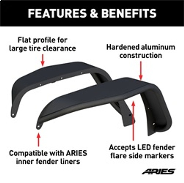ARIES Jeep fender flares add style and off-road readiness to your Jeep Wrangler JK, featuring rust-free aluminum construction, custom-fit contours and a narrower width to show off larger, off-road tires. Hardened, T6 aluminum alloy construction allows these fender flares to be strong, lightweight and rust-free. To maximum corrosion resistance, they are also covered in a durable carbide black powder coat finish that helps hide minor scratches and grime accumulated on the trail. They are also available in paintable, raw aluminum for added customization. ARIES Jeep fender flares are designed to replace the Jeep factory fender flares to better accent larger tires on off-road-style Wranglers. The front set features a 9-1/4" width and the rear set a 5-1/2" width. This gives them a sleek, trail-ready look, while still maintaining excellent functionality. ARIES Jeep fender flares also feature a vehicle-specific contour to offer a precise fit and added style. To add even more off-road-readiness to the Jeep JK, ARIES fender flares are designed to be complemented by ARIES front inner fender liners #1500350. They provide better engine protection than the factory liners and feature powder-coated aluminum construction. ARIES fender flares can also accept ARIES fender flare side markers #1500240 to maintain safety and help keep the vehicle street-legal. ARIES fender flares come with all necessary mounting hardware for a complete installation and are sold in pairs for the front or rear (some drilling may be required).