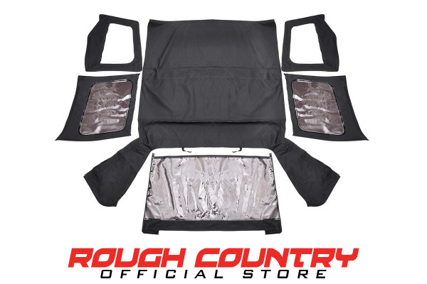 Whether youre restoring, updating, or trying to give your Jeep the look youve always wanted, Rough Countrys new Soft Tops give you the absolute best bang for your buck. Featuring a 23 Ounce UV and Mildew resistant Vinyl Coated Polyester Cotton material, our tops are engineered to hold up to the harshest elements. For further durability, Rough Countrys Soft Tops feature marine grade 135 gauge bonded polyester thread, double stitched with heat-tape sealed seams designed to take whatever you or Mother Earth can dish out. Our soft tops feature rear and quarter windows boasting a factory-like 31% tint, and incredibly strong 30mil thick, leak-proof windows. These DOT approved zip-on windows are easily removable to put the wind in your hair! Our lightning fast install process helps you get your Rough Country Soft Tops up and running in just minutes. Get a tight, wrinkle-free fit with our state-of-the-art Belt Rail and Hook & Loop attachments, designed to help you get a smooth, stable, snap-on fit with no additional modification necessary! Best of all, Rough Country Tops come with a 3 year warranty!'‹