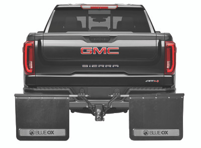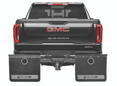 The Blue Ox Adjustable Mud Flap System kit is designed to protect the truck and towed items from flying rocks and debris.