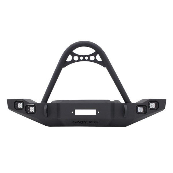 Snyper Marksman Stinger Front Bumper is a full width off-road winch bumper with welded stinger for Jeep JK. Made of 7 gauge steel and is pre-drilled for winch (up to 10.25 tall) mounting. Features four (4) openings for mounting flush mount LED auxiliary lights 1 thick shackle mounts and a laser-cut Snyper logo.