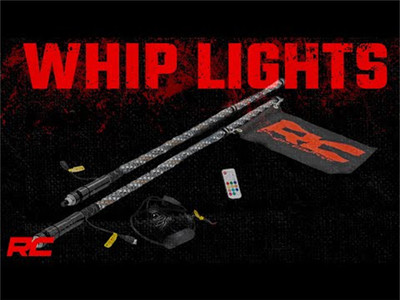 Turn heads along the trail with Rough Countrys two-piece LED Whip Light kit. These 4 foot tall, flexible LED whip lights feature a mind-blowing array of 300 unique, colorful patterns such as strobe, fade, rainbow, swirl, chase, and countless more. With 300 LEDs in a spiral formation, these LED whip lights are designed to produce a dazzling display of color combinations that make your vehicle stand out from the pack. Use the handy included remote to quickly change colors, patterns or dim the lights however you desire! Each unit is designed for maximum durability and display, with an IP67 waterproof construction thats built to ward off water, mud, and the elements for a long lifespan of cool colors. The innovative quick-release base allows you to effortlessly remove the whip lights from your UTV at any time while keeping the wiring intact. Each whip light also features a removable Rough Country flag mounted to a swivel bracket.