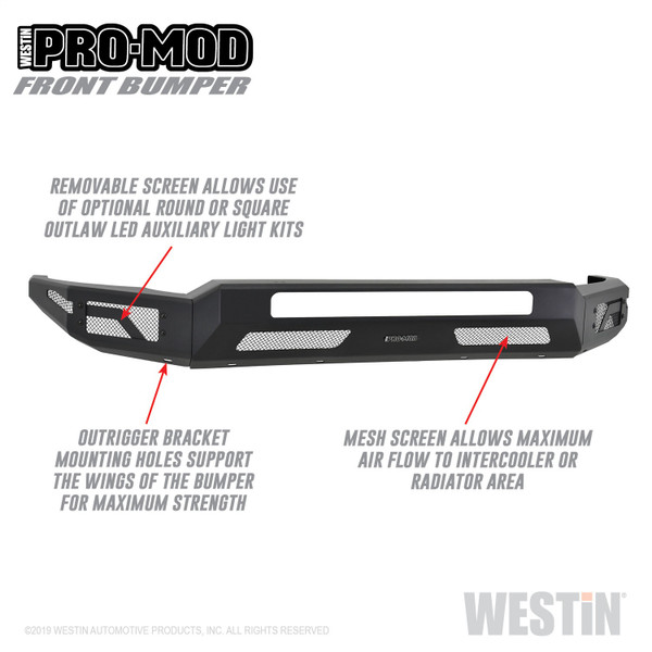 Westins Pro-Mod Front Bumper combines enhanced vehicle protection, with great looks. Pro-Mods revolutionary lightweight modular design is uniquely engineered with outrigger reinforcement brackets to provide maximum front end protection without compromising on strength, integrity or durability. The high and tight bumper profile creates a greater approach angle, which significantly improves off-road driving capabilities. The lightweight design also requires smaller shipping packages which dramatically reduces shipping costs. Pro-Mod bumpers feature a textured black finish with an e-coated base coat, providing long lasting corrosion protection from the elements. Once you see the Pro-Mod Front Bumper, the choice becomes obvious.