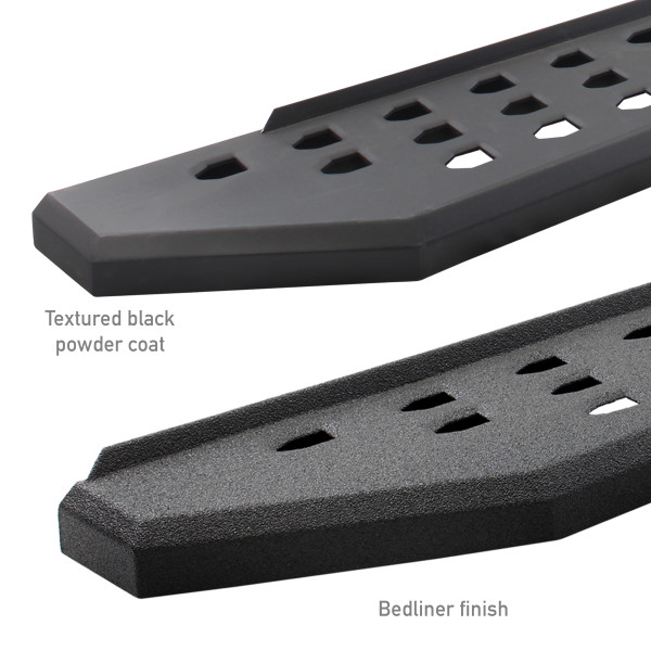 Go Rhino's legendary RB20 cab length running boards will make your truck, Jeep or SUV stand apart from the crowd. With an aggressive, yet stylish appearance, these bolt-on steps take their visual inspiration from the Ford Raptor but are made for more than just looks. The RB20's perforated holes, punched into the surface of the step, gives maximum traction and prevents mud, ice, and snow from accumulating. The corrosion-resistant 16-gauge steel steps are mounted high and tight, giving them plenty of clearance for off-roading, and are strong enough to support hundreds of pounds. The RB20 is offered in textured black powder coat or bedliner coating. Matching drop steps will make entering and exiting lifted vehicles even easier. Hardware and brackets are included. RB20 Running Boards With Drop Steps come with a Limited Lifetime warranty on materials and construction and a 5 year warranty on the the Textured Black Finish.