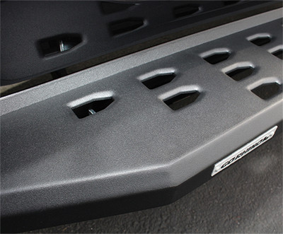 The legendary RB Series of cab length running boards from Go Rhino will make your truck, Jeep or SUV stand apart from the crowd. These, aggressive, stylish bolt-on side steps take their visual inspiration from the Ford Raptor but are made for more than just looks. The RB20 running boards have perforated holes punched into the surface of the step, which gives maximum traction and prevents mud, ice, and snow from accumulating. The corrosion-resistant 16-gauge zinc coated steel steps are mounted high and tight, giving them plenty of clearance for off-road adventures, and are strong enough to support hundreds of pounds. The RB20 is offered in textured black powder coat or rugged, bedliner coating. Hardware and brackets are included and installation on most vehicles will not require drilling. RB20 Running Boards come with a Limited Lifetime warranty on materials and construction and a 5 year warranty on the Bedliner Finish.