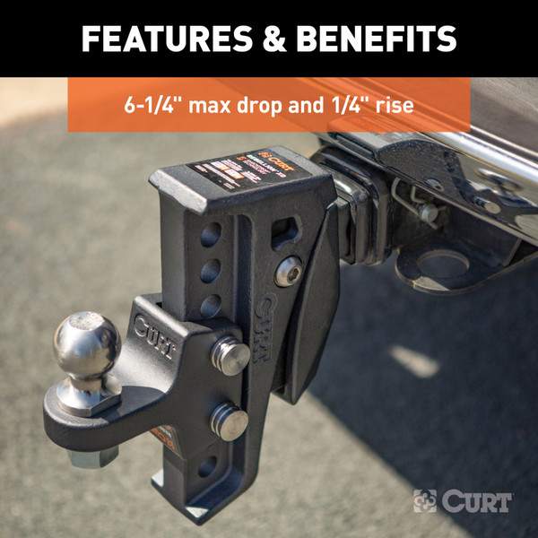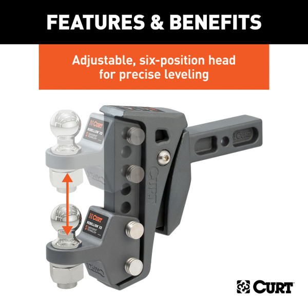 The CURT Rebellion XD adjustable cushion hitch ball mount upgrades your towing system with a smoother ride, greater control and enhanced longevity, all while providing exceptional towing power with virtually no need for maintenance. It is unlike any other ball mount because it operates using ShockDrop technology. At the core of this heavy-duty ball hitch is a cushion isolator that resists jerking, jarring, bumps, vibrations, chucking and rattling noise at the coupling point. Unlike a cushion hitch or torsion hitch that uses airbags or bearings, ShockDrop offers extended resistance to wear without the need for maintenance. The result is a more comfortable drive, increased driver control and better management of the vehicle-trailer combination in events of sudden braking. The adaptive, suspension mechanism and lightweight design of this cushion hitch help minimize stress on your vehicle and its suspension and braking systems. The Rebellion XD shock-absorbing hitch is also an adjustable trailer hitch ball mount, featuring a highly versatile vertical shank that promotes level towing, even with large, lifted trucks. The vertical shank has six height adjustment positions with a maximum drop of 6-1/4 and a max rise of 1/4 (shank cannot be flipped to rise position). For dependable towing strength, the Rebellion XD cushion hitch ball mount is tested and rated for 10,000 lbs. gross trailer weight and 1,000 lbs. tongue weight (limited to lowest-rated towing component). It has a standard 2 x 2 shank and comes with a stainless steel 2 trailer ball. For long-lasting weather resistance, the Rebellion XD is protected with a textured, dark grey teridium finish to withstand rain, dirt, UV damage and other corrosive threats.