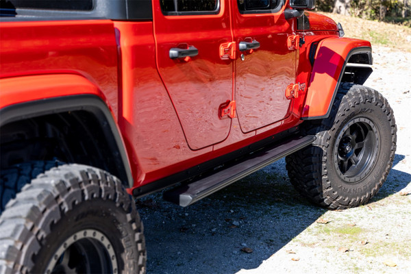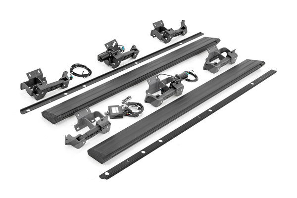 Rough Countrys RETRACT Electric Running Board Steps offer you a sleek, modern way to climb into your cab. These durable electric side steps feature a motorized swing-out function that instantly extends the step when you open the door. The convenient drop profile allows for easy entry and works great on trucks from stock height to any size lift. Once the door closes, the step automatically tucks away for a clean look. Rough Countrys retractable truck steps feature an easy Plug and Play assembly, connecting directly to your battery terminal and OBDII port for easy installation without the need for complicated wiring. With a durable aluminum construction and corrosion-resistant finish, these automated truck steps are designed for a long operational lifespan no matter where the road takes you. Includes a 3-year limited warranty!