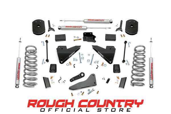 Compliment your RAM 2500s aggressive, good looks with Rough Countrys 5- in. Lift Kit. New model RAM Trucks come with a wealth of impressive features right from the factory. Rough Countrys 5- in. kit was engineered to retain these impressive factory specs while bumping up performance and durability where its needed most. The result is a lifted beast with a mean profile and lush ride-quality thatll make other RAM owners wonder where you got yours from!Rough Countrys 5- in. Lift Kit is designed for Dodge RAMs equipped with either factory rear coils or factory rear air ride suspension. On Air Ride models, this kit uses a rear air bag spacer that works with the factory air bag to provide rear lift. This kit also features a Rear Sensor Arm Relocation Bracket that can modify how the sensor link speaks to the computer to determine what the ride height is. This allows you to adjust the amount of rear height up to 1- in. higher than the front by way of multiple mounting points spaced by 1/4- in.. Pick the mounting point you want for the rear ride height you prefer.When changing a vehicles suspension, the key to preserving ride quality is in keeping the geometry of all suspension components as close to their factory angles as possible. Rough Countrys 5- in. Suspension kit features a set of Radius Arm Drop brackets allowing you to retain the beefy factory arms while keeping everything at optimum angles. This kit also features a set of front, lifted coil springs, anti-wrap rear blocks and N3 Shocks for a fantastic blend of smooth highway ride and awesome off-road performance.