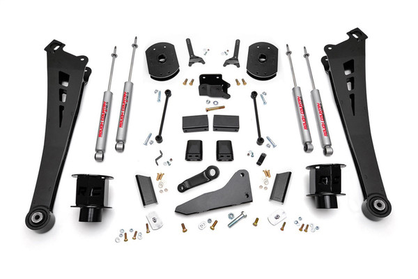 Create A New AccountCompliment your RAM 2500s aggressive, good looks with Rough Countrys new 5- in. Lift Kit. New model RAM Trucks come with a wealth of impressive features right from the factory. Rough Countrys new 5- in. kit was engineered to retain these impressive factory specs while bumping up performance and durability where its needed most. The result is a lifted beast with a mean profile and lush ride-quality thatll make other RAM owners wonder where you got yours from!Rough Countrys 5- in. Lift Kit is designed for Dodge RAMs equipped with either factory rear coils or factory rear air ride suspension. On Air Ride models, this kit uses a rear air bag spacer that works with the factory air bag to provide rear lift. This kit also features a Rear Sensor Arm Relocation Bracket that can modify how the sensor link speaks to the computer to determine what the ride height is. This allows you to adjust the amount of rear height up to 1- in. higher than the front by way of multiple mounting points spaced by 1/4- in.. Pick the mounting point you want for the rear ride height you prefer.When changing a vehicles suspension, the key to preserving ride quality is in keeping the geometry of all suspension components as close to their factory angles as possible. Rough Countrys new 5- in. Suspension kit features a set of ultra-durable Radius Arms, precision fit to bolt right into the factory mounts for an easier install and a more factory-like angle. These beefy, upgraded Radius Arms also feature a durable, Clevite Rubber Bushing for maximum vibration absorption. In a further effort to preserve the trucks factory ride, this kit retains the factory progressive rate coil spring -- designed by Dodge specifically for the weight and ride quality of these new model trucks.