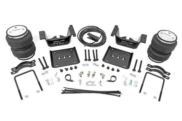 Is your truck your workhorse? The main attraction to the pick-up line is the accessibility to haul and tow as desired. However, due to the amount of weight in the bed, or the condition of the vehicles rear leaf springs, this can cause the vehicle to be un-level when under load. Here at Rough Country, we created an innovative new product to ensure that these are troubles of the past. Introducing, Rough Countrys Rear Air Spring Kit. Rough Countrys Rear Air Spring Kit features two RC branded high-quality double convoluted airbags complemented with DOT-approved airlines. Whether you plan on towing or hauling in the not-so-distant future Rough Countrys Air Spring kit is the must-have accessory to ensure that your trailer is level reducing the weight-off of the tongue of your trailer. Each kit offers 1/4 in. push connector fittings and all of the bracketry needed to ensure installation is lightning fast and secure! Best of all, Rough Countrys Air Spring kit provides up to 5,000 lbs. of load support to ensure that you experience less sway and bottoming out when braking and steering! Give yourself peace of mind on your next haul with Rough Countrys Air Spring Kit!