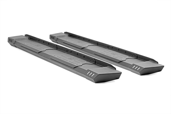 Swap out your skinny, factory running boards with Rough Countrys wider and more aggressive HD2 Running Boards! These beefy, cab-length running boards make it much easier to get in and out of your truck.With a durable all-steel construction and reinforced mounting solution, these running boards remain strong and sturdy through years of climbing into your cab. Each step features two non-skid plates with a stamped 'œRC' logo for good looks and easy entry. The 'œtech' style design gives your truck a unique look thats much more aggressive than factory steps, while the wider profile is perfect for proper footing and looks more proportional to the larger trucks of today.Give your truck a unique style and commanding presence with this incredible upgrade. Features Rough Countrys Lifetime Replacement Warranty!