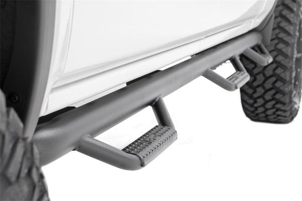 Rough Country's new Wheel to Wheel Nerf Steps provide unrelenting style and easier access to your truck. These steps extend from one wheel well opening to the next, offering a clean install that lends to the look of your lifted truck. These steps can be installed on any vehicle, with or without a body lift. Our innovative design actually hides any exposed frame you see under the truck, offering extra protection for your rocker panels. Rough Country Nerf Steps are Made out of ultra-durable .084 Wall corrosion resistant tubing with a Zinc Base Coat and Black Finish for a sharp look that's ready to withstand the elements. Rough Country Steps include a Lifetime Replacement Warranty!