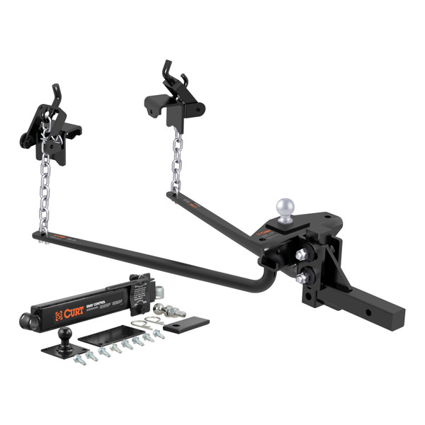 The CURT weight distribution hitch is a specialized towing system that provides improved vehicle and trailer control by leveling the trailer and more evenly distributing its tongue weight across the trailer's and vehicle's axles. Weight distribution hitches are commonly used on travel trailers and campers but can also be applied to other large loads. CURT WD hitches come with a 2 x 2 shank and are compatible with class 3, 4 and most 5 trailer hitches, including Xtra Duty and Commercial Duty (2-1/2 replacement WD shank may be required), as well as some RV trailer hitches. While a weight distribution hitch will increase the gross trailer weight capacity of most trailer hitches, the vehicle's weight carrying capacity must be taken into consideration before towing a heavier trailer (NOTE: Never exceed the lowest weight capacity of any towing component).This round bar weight distribution hitch features a heavy-duty formed head and round spring bars constructed from forged steel. It offers a gross trailer weight capacity up to 14,000 lbs. and a tongue weight capacity of 1,400 lbs. It also includes hook-up brackets, spring bar safety chains, a trailer ball and a pin and clip. To protect this hitch from scratching, chipping, rust and UV damage, it also comes with a durable black powder coat finish. For added sway control, this weight distribution hitch includes a sway control unit. While weight distribution hitches are an effective solution for stabilizing and leveling out your towing rig, they should not be considered a sway control. However, when combined with a CURT sway control kit, the WD hitch maximizes its effectiveness in controlling sway. The sway control kit includes a sway control unit, trailer balls to attach to the trailer and hitch, a reinforcement plate and attachment clips.
