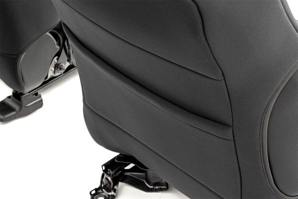 Protect your Tacomas seats from water, mud, and anything you can throw at it with Rough Countrys front and rear Neoprene Seat Covers. These easy-to-install covers fit snugly over your trucks seats to protect your interior from the elements while blending in perfectly.These comfortable seat covers feature a 4-layer construction with thick foam padding for a comfortable feel and durable quality. The outer Neoprene protective layer wards off water and mildew while being soft to the touch and offering great breathability. Each cover is designed to be an exact fit on your vehicle, with accessibility for airbags, seat adjustment, and more! No tools are required for this fast and simple upgrade, just slip each cover firmly over the seat and fasten with the built-in straps and youre ready to roll!Pick up a set of front seat covers to save your most-used seats from additional wear, or a rear set to protect your back seat from stains caused by kids or animals. Or choose front and rear for full seat protection!