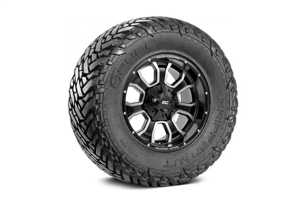 Create A New AccountSet yourself apart from the pack with Rough Countrys One-Piece Series 93 Wheels. This 7-spoke black and machined wheel offers an incredible look thats sure to turn heads. This one-of-a-kind wheel features 7 spokes that flare out near the lip for a dramatic visual style thats perfect for any lifted vehicle. This stylish wheel features a gloss black coat with machined accents that pop under any truck or Jeep. Fuel Off-Roads Gripper tire never ceases to impress. The Gripper is engineered to withstand the harshest off-roading conditions, while still providing legendary function when actual roads need to be driven. With a wide range of sizes and options for your truck, the Gripper is the obvious choice.
