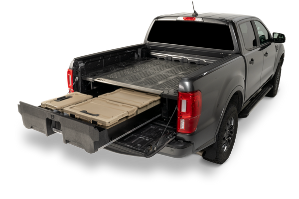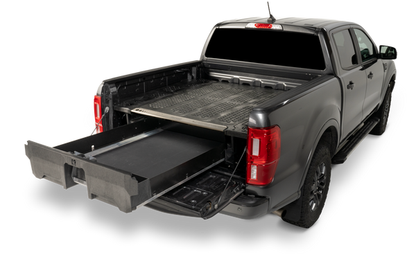 The DECKED in-vehicle storage system offers secure, weatherproof and organized storage with a sliding drawer toolbox system for pick up trucks. 100% American made, the DECKED system features two secure, full bed-length drawers capable of carrying 200lb each that glide effortlessly on industrial-grade wheels beneath a 2,000lb payload-rated deck. Constructed from rugged High Density Polyethylene (HDPE) and steel, owners get ergonomic access to tools and equipment while maintaining full use of the truck bed. DECKED systems are perfect for contractors, painters, carpenters, electricians, surveyors, plumbers, handyman services and the outdoor enthusiast who need their truck to have secure storage bins that are easy to access. The drawers slide out at waist height while still allowing the owner full use of their truck bed. The system, once assembled, is easily installed and removed. Accessories are available for customizable storage.