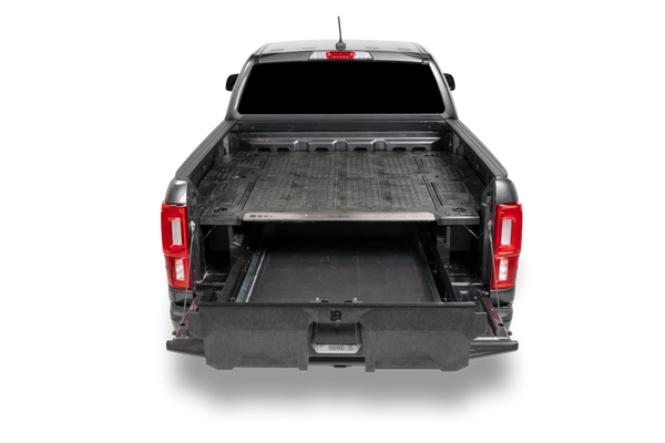 The DECKED in-vehicle storage system offers secure, weatherproof and organized storage with a sliding drawer toolbox system for pick up trucks. 100% American made, the DECKED system features two secure, full bed-length drawers capable of carrying 200lb each that glide effortlessly on industrial-grade wheels beneath a 2,000lb payload-rated deck. Constructed from rugged High Density Polyethylene (HDPE) and steel, owners get ergonomic access to tools and equipment while maintaining full use of the truck bed. DECKED systems are perfect for contractors, painters, carpenters, electricians, surveyors, plumbers, handyman services and the outdoor enthusiast who need their truck to have secure storage bins that are easy to access. The drawers slide out at waist height while still allowing the owner full use of their truck bed. The system, once assembled, is easily installed and removed. Accessories are available for customizable storage.