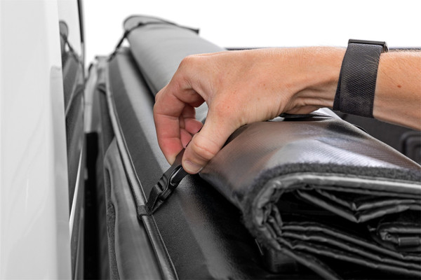 Rough Countrys Soft Roll-Up Bed Cover keeps the contents of your bed clean and dry while allowing maximum bed access when you need it. Made with a durable, leather-grain fabric, this easy-to-install bed cover is designed to withstand the elements, featuring tight front and rear seals to keep water, dust and dirt at bay. The convenient roll-up design allows you to take advantage of your entire truck bed whenever you need it, while the pre-set tension control keeps your cover tight and flat for a minimum profile that looks good year after year. Each cover includes a set of durable paddle latches for a firm, secure fit, and the easy-to-install mounting system allows you to get up and running with your new cover in no-time flat!