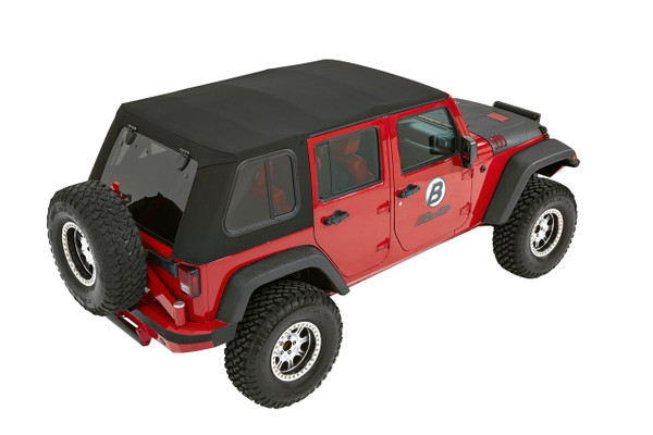 Bestop Trektop Pro Soft Top is truly a top for all seasons. It is the next step in soft top design for your Jeep Wrangler Unlimited JK. A true hybrid that integrates the easy-lift rear glass hatch of a hard top with the advantages of an ultra premium soft top. This is the first hard rear glass hatch on a soft top for easy, one hand operation and easy accessibility to rear cargo area. The rear glass hatch has gas assist struts and integrated defroster connector plus rear wiper motor assembly mounting point. The sliding glass side windows offer extra ventilation for rear seat passengers or pets. With the side panels and rear glass removed, the Trektop Pro becomes a Safari Bikini for open air driving.