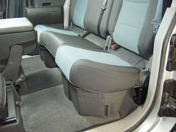 Whether you're a contractor, sportsman, or simply someone looking for a great way to organize your pickup truck, the DU-HA(R) is perfect for you. The DU-HA(R) allows you to store your guns and gear - ammunition, hunting gear, fishing gear, tackle, GPS, binoculars, power tools, rain gear, tow ropes, tie down straps, first aid kit, bungee straps, jack, hats, boots, gloves, jackets, chains, jumper cables, and more - safely and securely underneath the back seat of your truck. Each DU-HA(R) is made specifically to fit a particular make and model of truck, so the fit is perfect. This also maximizes the available storage area. Easy to install. Simply lift the rear seat, slide it in, and fasten it in place! After using a DU-HA(R) underseat storage unit, you'll wonder how you ever got along without it!