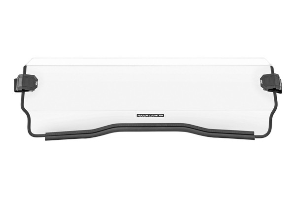 Added Protection and comfortability. Protect the occupants of your Polaris RZR from off-road hazards such as rocks, branches, and other debris with Rough Countrys Scratch-Resistant Windshields. UTV Windshields offer a clear visual of the trail ahead and allow for a much more comfortable outing! High-Quality Polycarbonate Construction. Rough Country UTV windshields are constructed from thick polycarbonate material that is precision cut for a perfect fit. The polycarbonate material provides an ideal combination of clarity, flexibility, durability that outperforms glass, acrylic, and other windshield materials. Durable Scratch and UV Resistance. Each windshield is not only constructed from thick polycarbonate material but enhanced by a secondary AR2 hard-coating process. This process completely coats the windshield with a hardened, scratch-resistant barrier. This treatment also provides the additional benefit of UV protection. Easy Installation. With a simple strap-on installation process, installing a Rough Country windshield couldnt be easier. Within 15 '' 30 mins you can be ready to hit the trails. Limited-Lifetime Replacement Warranty. Rough Countrys Scratch-Resistant Windshields are backed with a limited lifetime replacement warranty towards manufacturer defects. As such, the product is protected from structural and workmanship damage after the date of purchase. With our industry-leading warranty give yourself peace of mind when using Rough Countrys Suspension products!