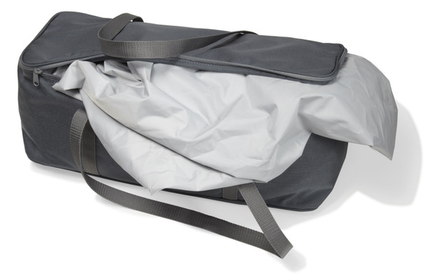 Zippered storage bag with web straps. Constructed of durable vinyl-coated polyester fabric. Helps keep cover neat and clean when not in use. Two sizes fit most covers.